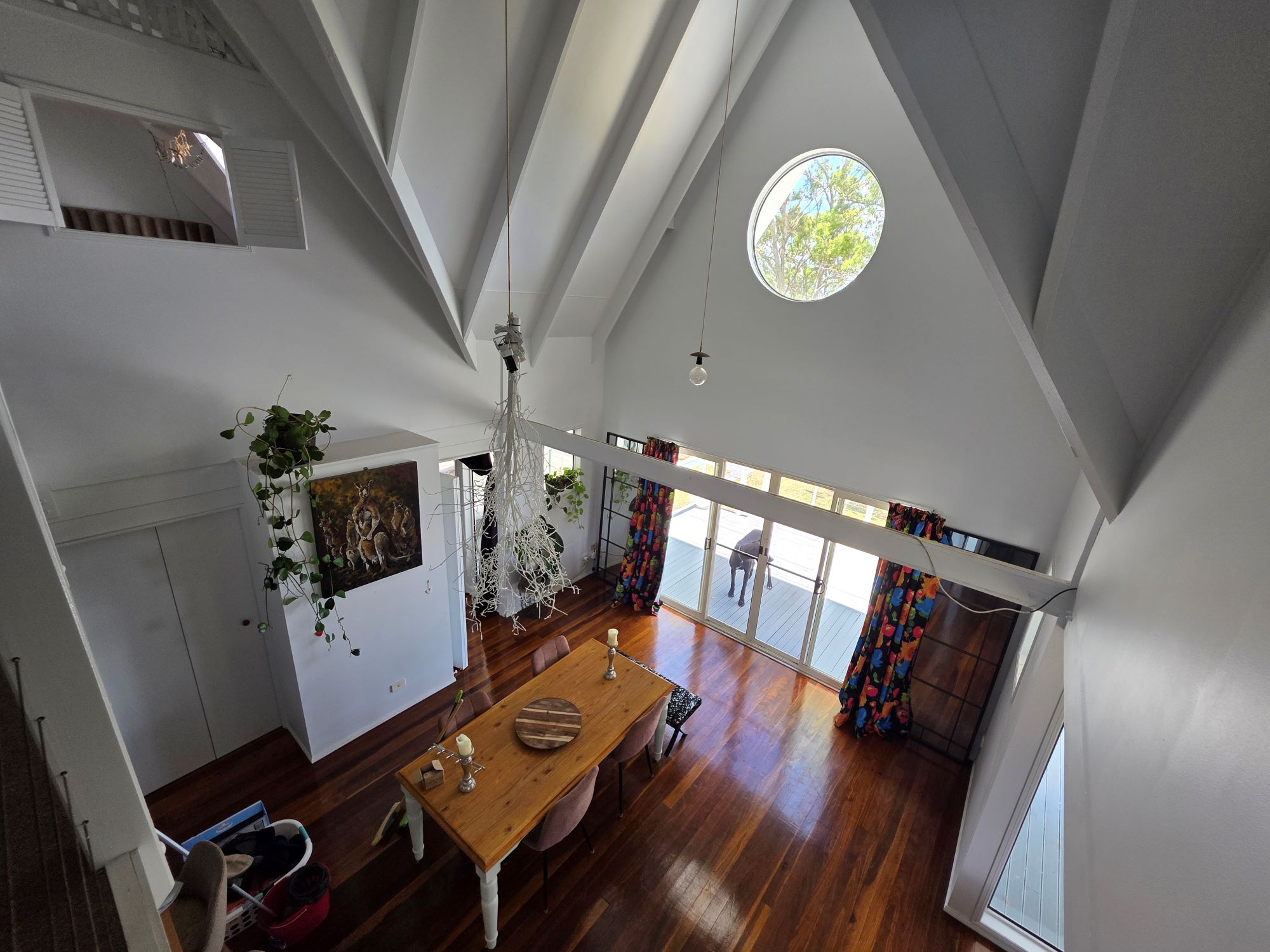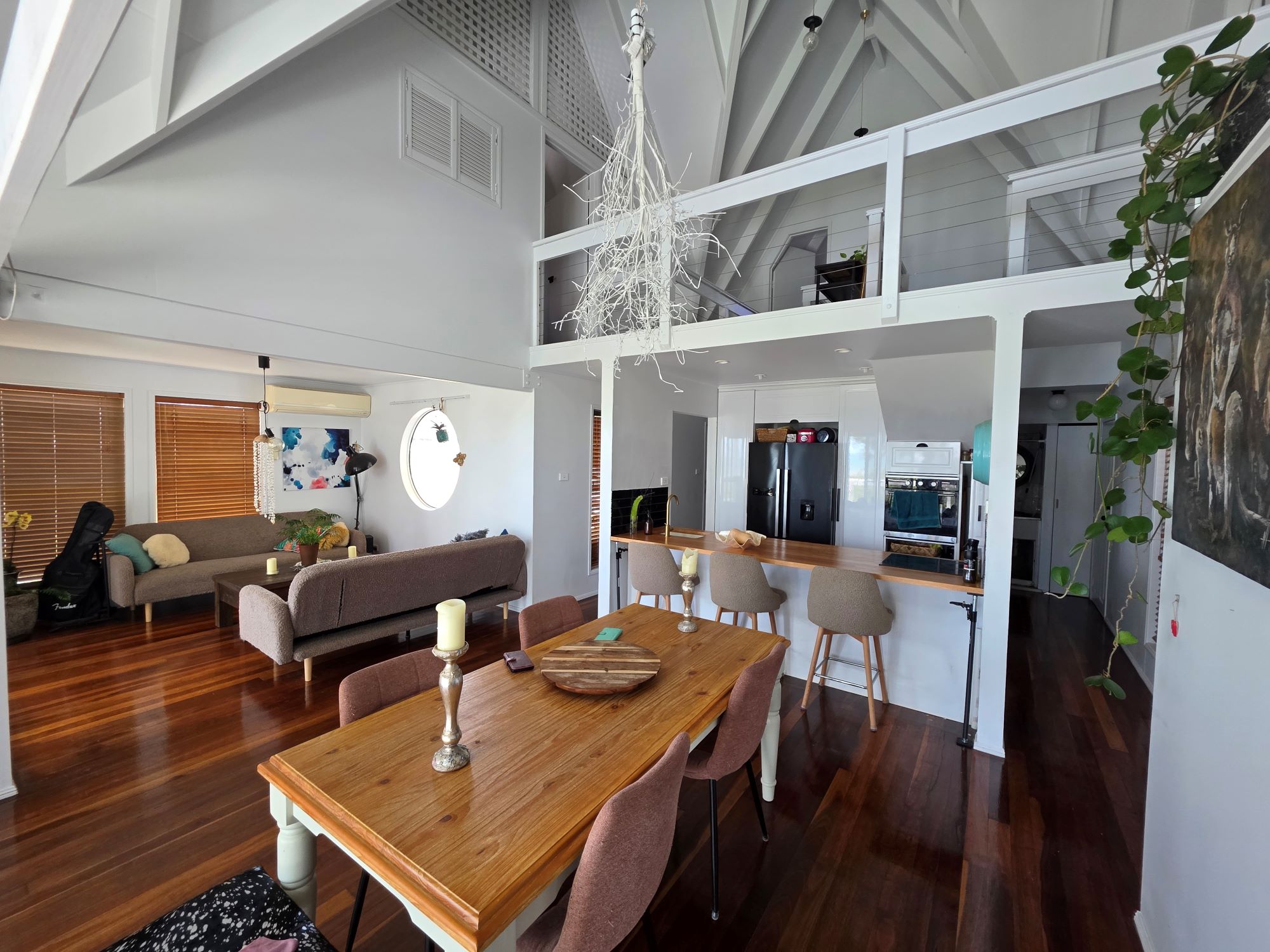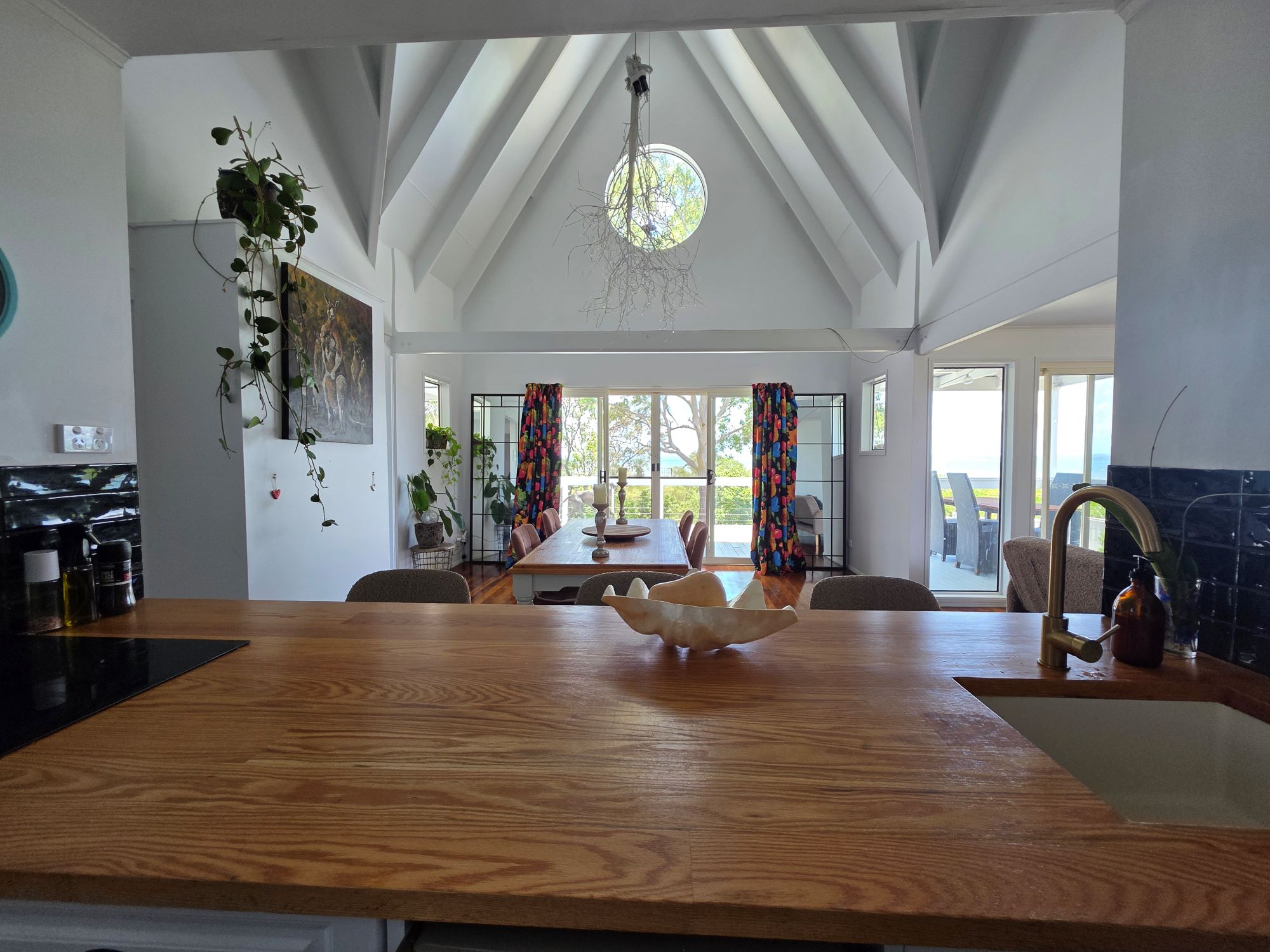 Dining room and lounge room, both with doors opening out to the veranda, high raked ceilings, and sea/island views